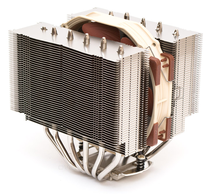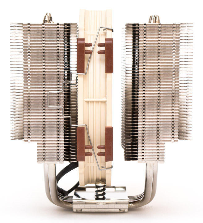 Конструктивные различия между Noctua NH-D15 и NH-D15S отнюдь не бросаются в глаза, даже если поставить их рядом. Возможно первое, на что обратит внимание покупатель — наличие только одного вентилятора вместо двух. И дело тут не в банальной экономии, а как раз в увеличении совместимости. Один пропеллер, расположенный между радиаторными секциями, можно полностью спрятать (так чтобы он не выступал за кончики тепловых трубок). А это значит, что предельная высота кулера не превысит 160 мм и он поместится в подавляющее большинство современных корпусов.