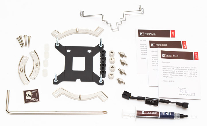 Комплект поставки кулера стандартен для Noctua. Все детали заботливо разложены по отдельным подписанным пакетикам и коробочкам. Помимо вентилятора и радиатора здесь есть: