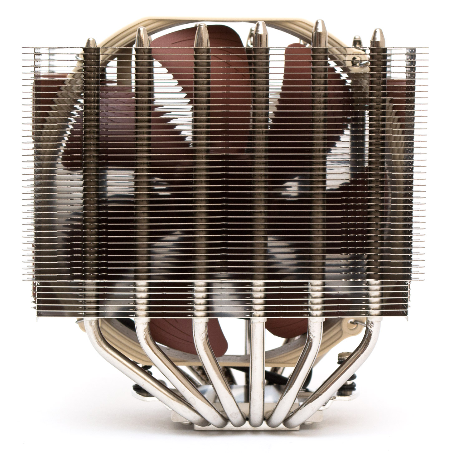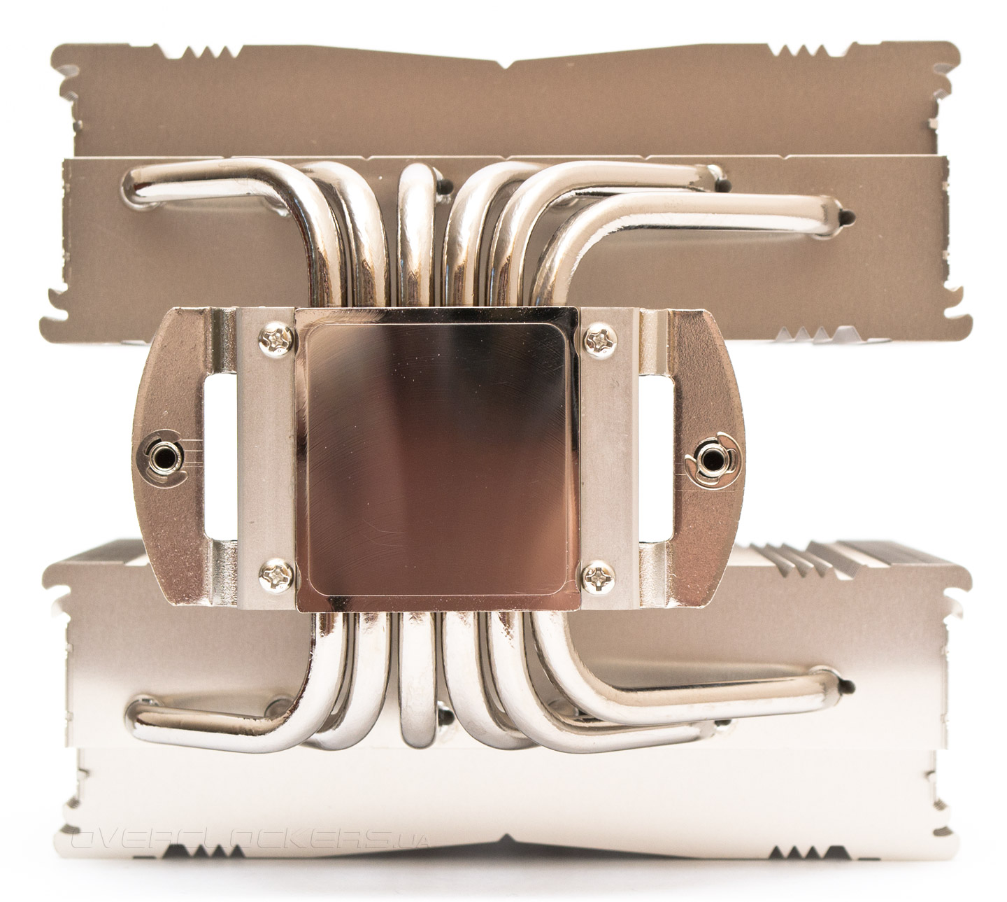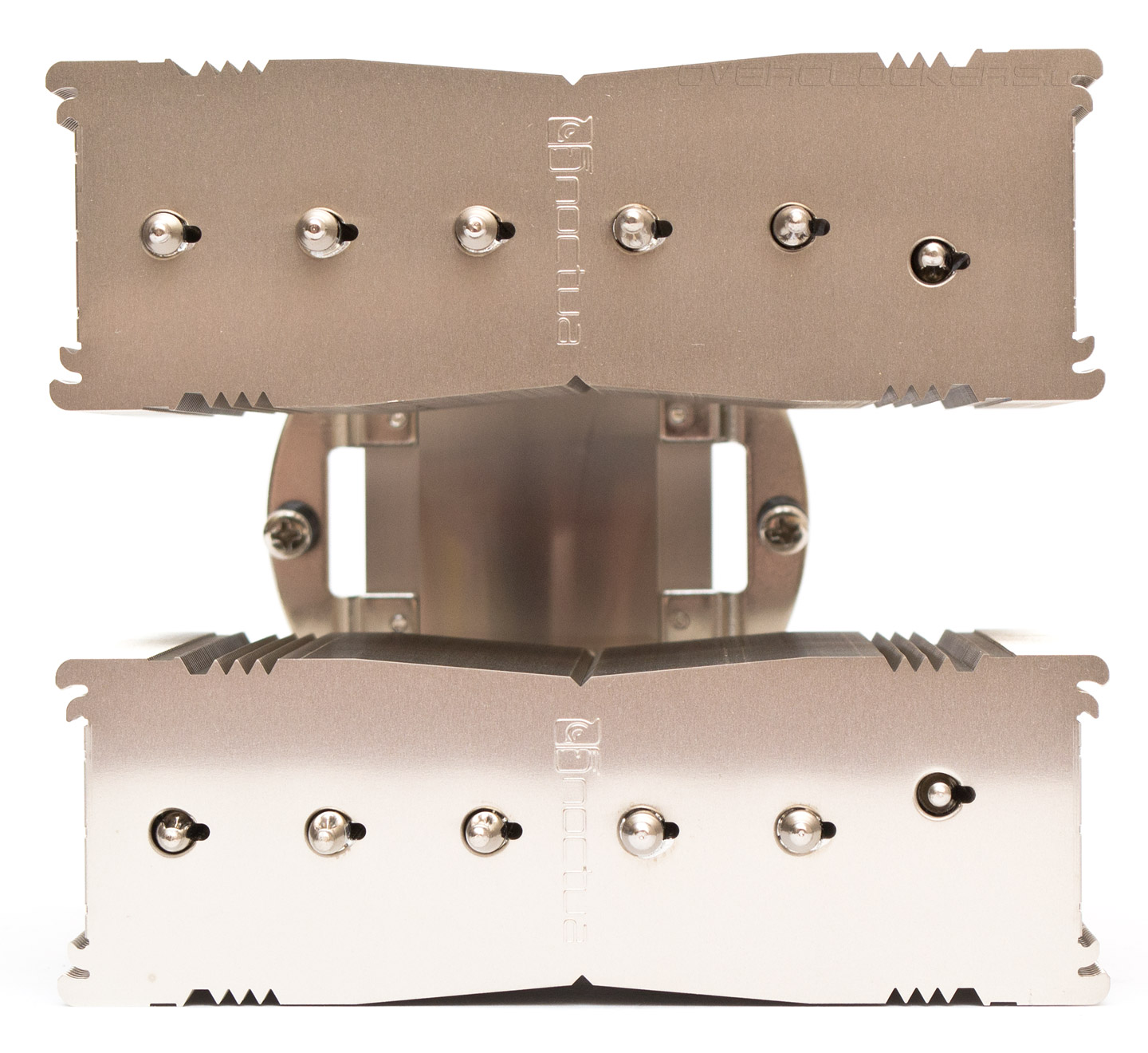 При взгляде сверху видно лишь одно отличие NH-D15S от NH-D15 — шестая тепловая трубка каждой секции выбивается из общего ряда и сдвинута внутрь радиатора. Зачем это понадобилось — сказать точно сложно. Либо это как-то улучшает прочность радиатора, либо служит, чтобы избежать конфликта с какими-то компонентами материнской платы.