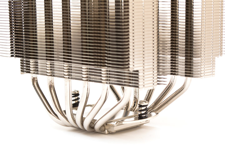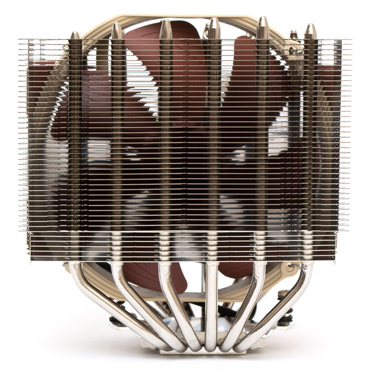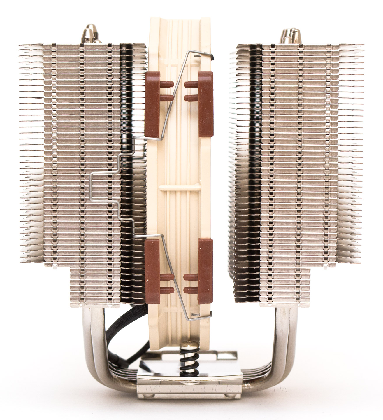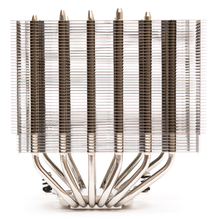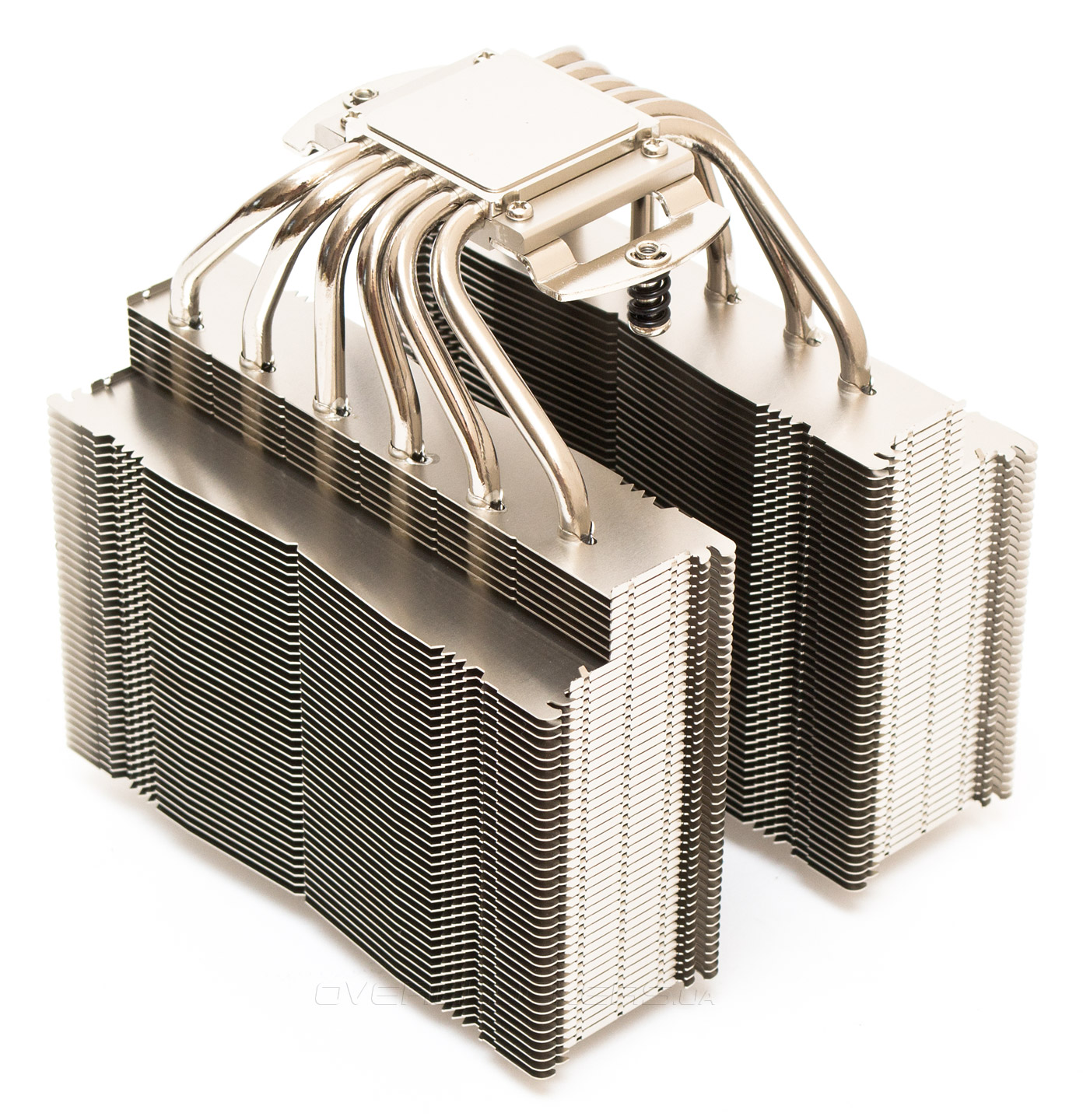 При взгляде сверху видно лишь одно отличие NH-D15S от NH-D15 — шестая тепловая трубка каждой секции выбивается из общего ряда и сдвинута внутрь радиатора. Зачем это понадобилось — сказать точно сложно. Либо это как-то улучшает прочность радиатора, либо служит, чтобы избежать конфликта с какими-то компонентами материнской платы.