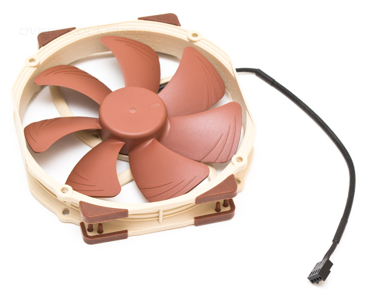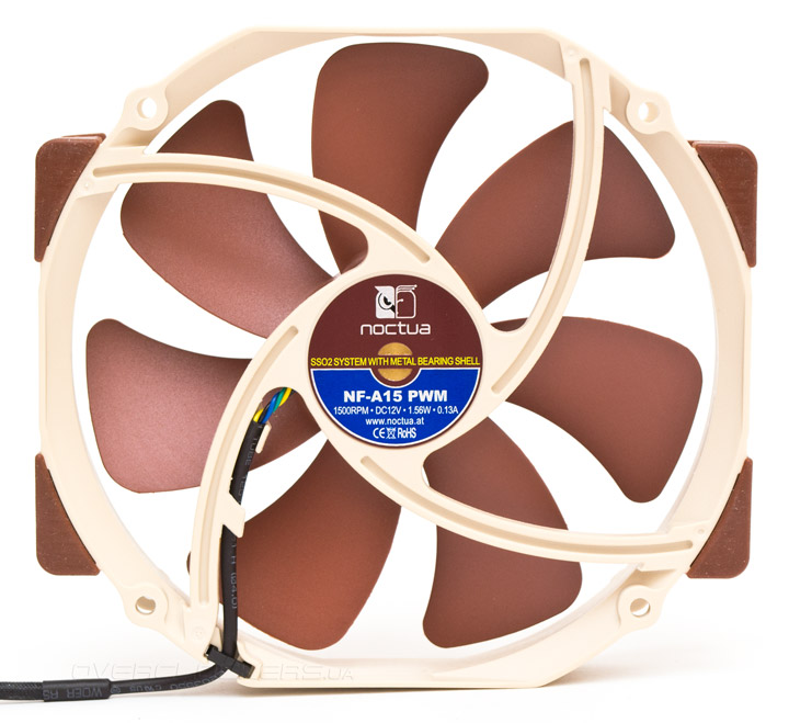 Вентилятор называется Noctua NF-A15 PWM, имеет габариты 150х140х25 мм и посадочные места от обычных 120-мм моделей. Скорость вращения крыльчатки составляет от 400 до 1500 об/мин и регулируется посредством ШИМ (который не имеет паразитных призвуков), а уровень шума колеблется в диапазоне от 34 до 53 дБ (А) соответственно. До 900 об/мин пропеллер остается неразличимым из закрытого корпуса. Резистор NA-RC7 позволяет при подключении снизить предельную скорость до 1200 об/мин. В качестве подшипника используется фирменная разработка компании, которая называется SSO2 (гидродинамический с магнитной стабилизацией). Электрические характеристики видны на фотографии: