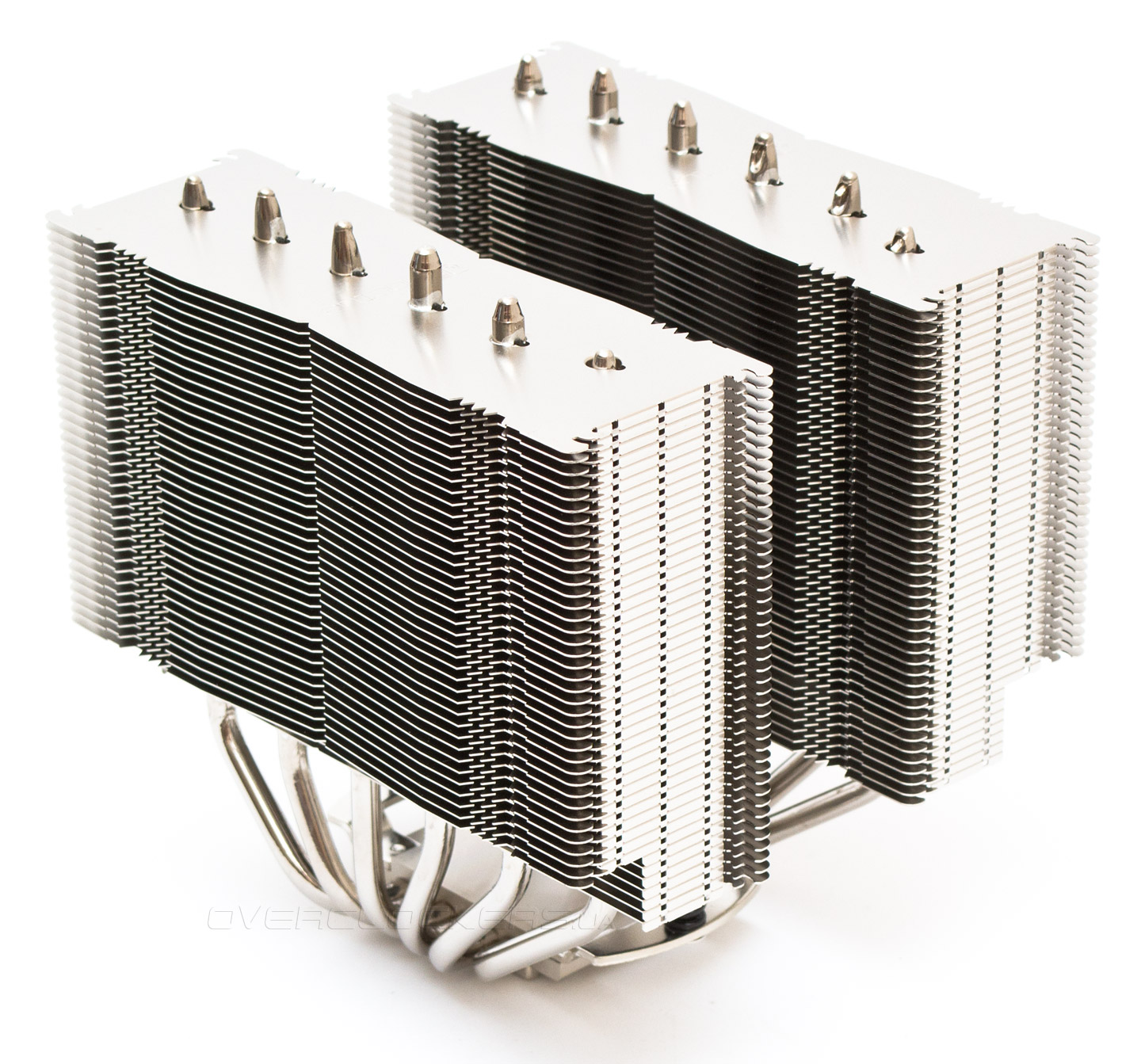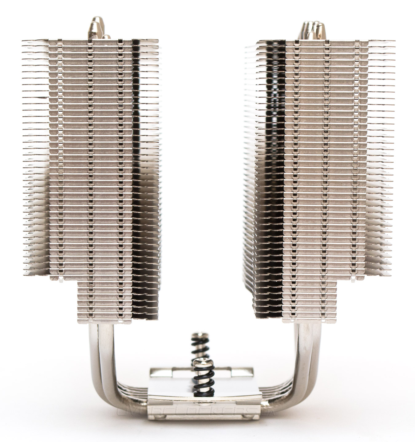 В профиль ничего не изменилось. 45 радиаторных пластин в каждой секции расположены с зазором в 2 мм. Нижние семь ребер с каждого бока укорочены по ширине наполовину, чтобы создать 65 мм пространства по высоте для установки оперативной памяти, что особенно актуально при монтаже кулера на процессорный разъем Intel LGA2011.