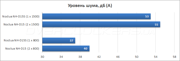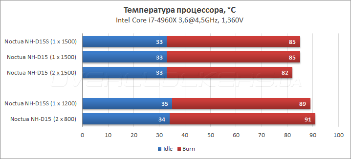 Оба кулера показали одинаковые результаты с одним вентилятором, что говорит об идентичности конструкций их радиаторов. За счет второго пропеллера на высокой скорости NH-D15 ожидаемо смог отыграть три градуса. При понижении оборотов процессор оказался на грани перегрева как с одним, так и со вторым кулером, поскольку температура быстро перевалила за 90 градусов.