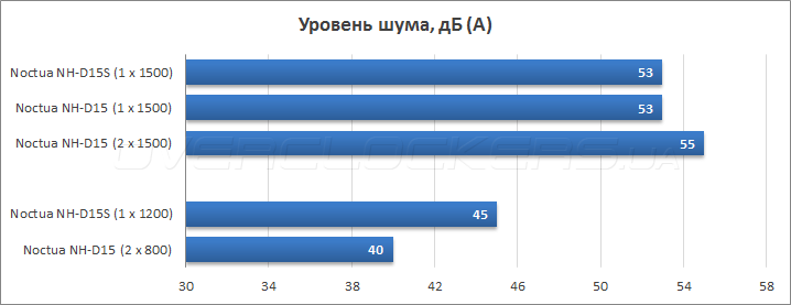 В том, что касается уровней шума, на 2011 сокете были опробованы варианты как с одним, так и с двумя вентиляторами на максимальной скорости. Но на минимальных оборотах NH-D15S не справился с охлаждением разогнанного Core i7 4960X, потому решено было ограничиться скромным снижением скорости до 1200 об/мин (что соответствует работе кулера вместе с ограничивающим максимальные обороты переходником).