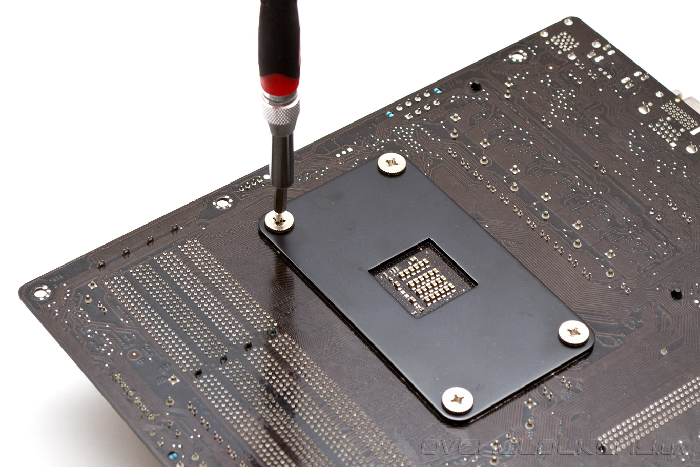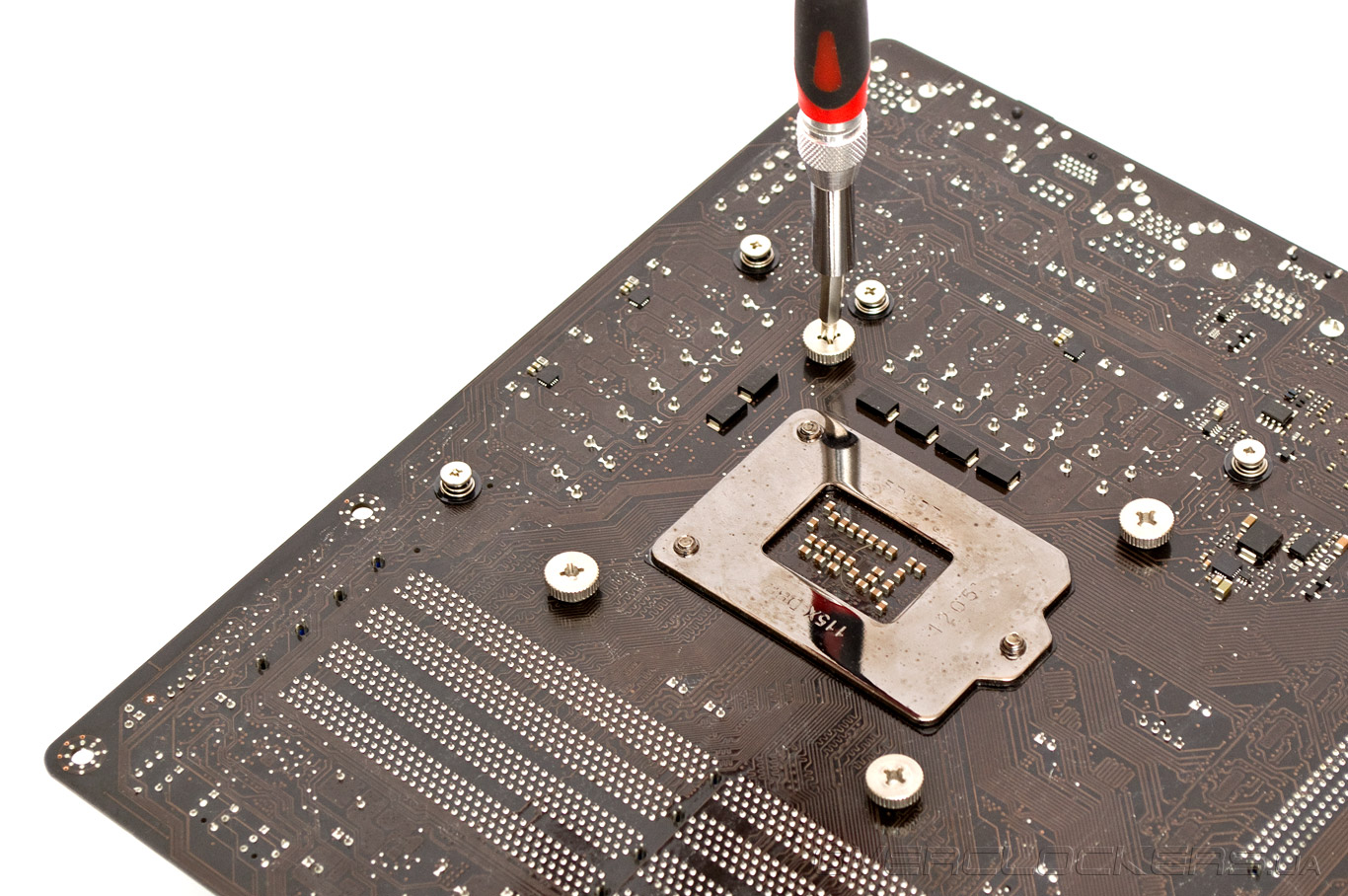 Затем используем четыре винта с накатанной головкой (они имеют кодовое название NM-IBT4), чтобы надежно зафиксировать кулер. Затягивать их проще отверткой, которую Noctua, к сожалению, не включила на этот раз в комплект поставки. Пластиковые изоляторы на винтах предотвращают их от контакта с материнской платой.