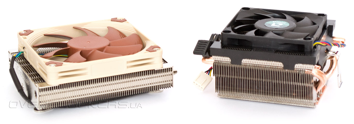 Соперник для Noctua NH-L9a был подобран более серьёзный. Им стал стоковый кулер от AMD FX-8320, произведенный компанией Cooler Master, 56-мм в высоту, оснащенный 70-мм вентилятором с максимальной скоростью вращения 3300 об/мин и четырьмя тепловыми трубками. Вес – 325 гр.
