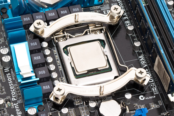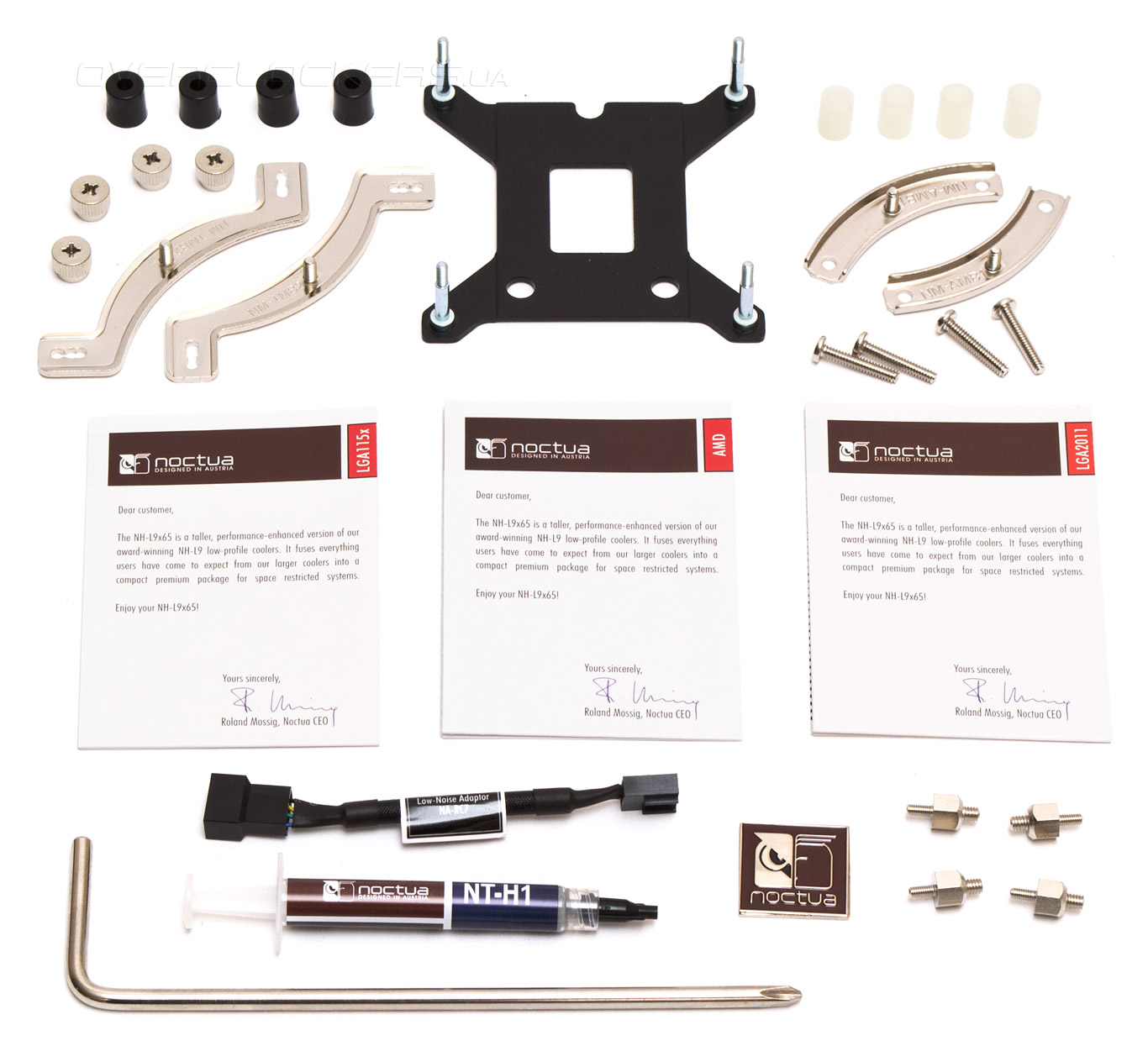 Монтаж кулера будет продемонстрирован на примере разъема Intel LGA1155. Помимо него, Noctua NH-L9x65 поддерживает установку на сокет Intel LGA2011/LGA2011-3 (с квадратным расположением крепежных отверстий) и все актуальные процессорные разъемы AMD. Теоретически, его можно установить и на Intel LGA775 или LGA 1366, но для этого придется заказывать у компании другую усилительную пластину. Поскольку усилительный элемент из комплекта поставки подойдет лишь для семейства сокетов Intel LGA115x.