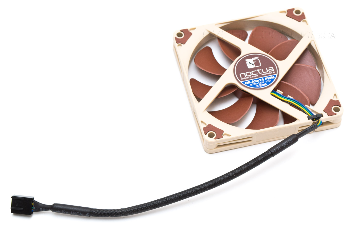 В качестве пропеллера используется модель, с которой мы уже сталкивались ранее в тестах кулеров Noctua NH-L9a и NH-L9i. Это Noctua NF-A9x14 PWM размером 92х92х14 мм, с девятью плавно загнутыми лопастями и гидродинамическим подшипником с магнитным центрированием. Разъем питания четырехконтактный, длина шнура составляет 20 см. Скорость вращения крыльчатки регулируется методом ШИМ-модуляции в диапазоне от 600 до 2600 об/мин (57 дБ (А)). В случае установки адаптера L.N.A., верхний предел скорости снижается до 1800 об/мин (46 дБ (А)). Неслышимый из закрытого корпуса уровень шума — 40 дБ (А), вентилятор достигает при скорости 1400 об/мин. Более детальные электромеханические характеристики можно рассмотреть на фотографии, в нашей спецификации или на официальном сайте Noctua.