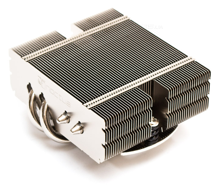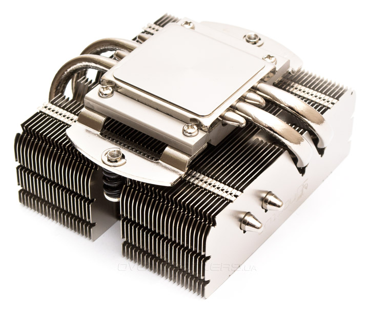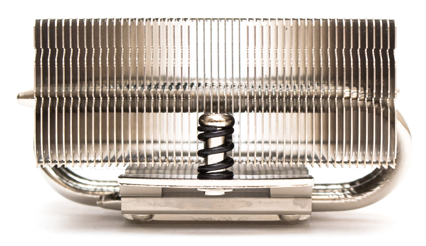 Основную роль в передаче тепла от процессора играют четыре испарительные трубки, которые выходят из основания и равномерно по С-образной траектории пересекают всю рабочую поверхность тела радиатора навстречу друг другу, по две с каждой стороны. Так обеспечивается оптимальное распределение тепла во всем ребрам.