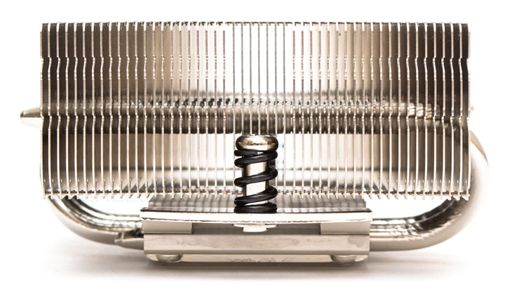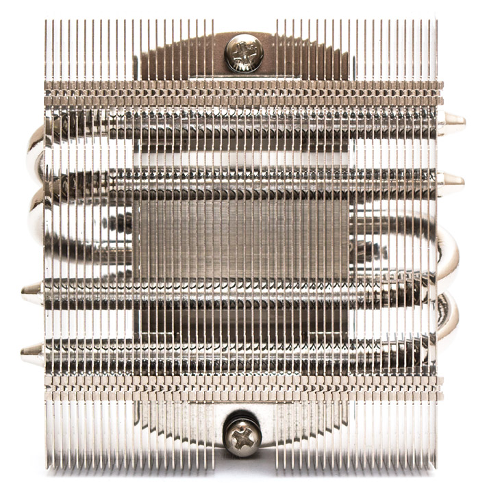 Сняв вентилятор, мы получаем возможность детальнее рассмотреть устройство радиатора. Основная его часть состоит из вертикальных алюминиевых ребер, дающих в сумме площадь рассеивания в 3100 см2. Посередине, в массиве радиаторных пластин, сделано два выреза, необходимых для того, чтобы добраться отверткой до крепежных винтов. Никаких аэродинамических оптимизаций на пластинах нет, да и бессмысленны они при столь маленьких габаритах. Два ряда канавок по бокам, со стороны винтов служат для крепления скобами 14- или 25-мм по толщине вентилятора.