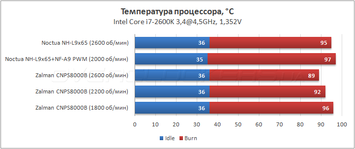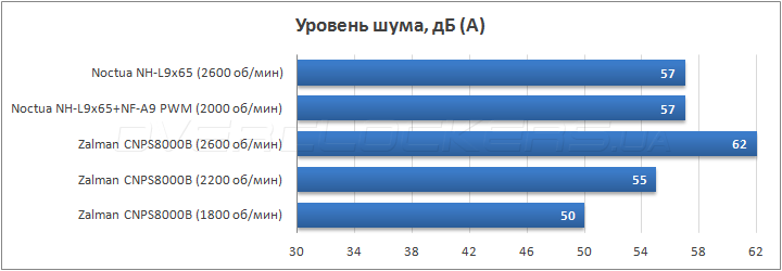 Эффективность отвода тепла кулером Noctua NH-L9x65 сравнивалась с аналогичным по конструкции и назначению охладителем Zalman CNPS8000B.