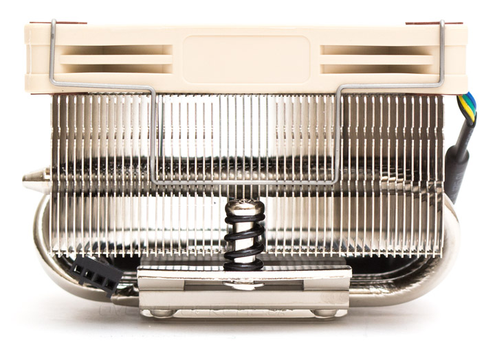 Основным требованием при проектировании Noctua NH-L9x65 было не превышение габаритов посадочного квадрата Intel — 95х95 мм, в целях совместимости с любыми Mini-ITX платами, где процессорный разъем расположен слишком близко к другим компонентам. И нужно сказать, что компании это удалось. Если смотреть сверху, то радиатор практически не видно за комплектным вентилятором. Другими словами, в корпусе его не будет заметно.