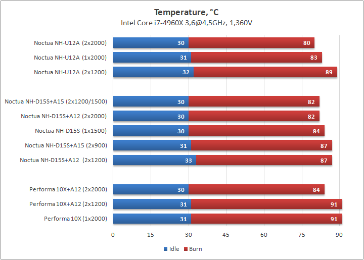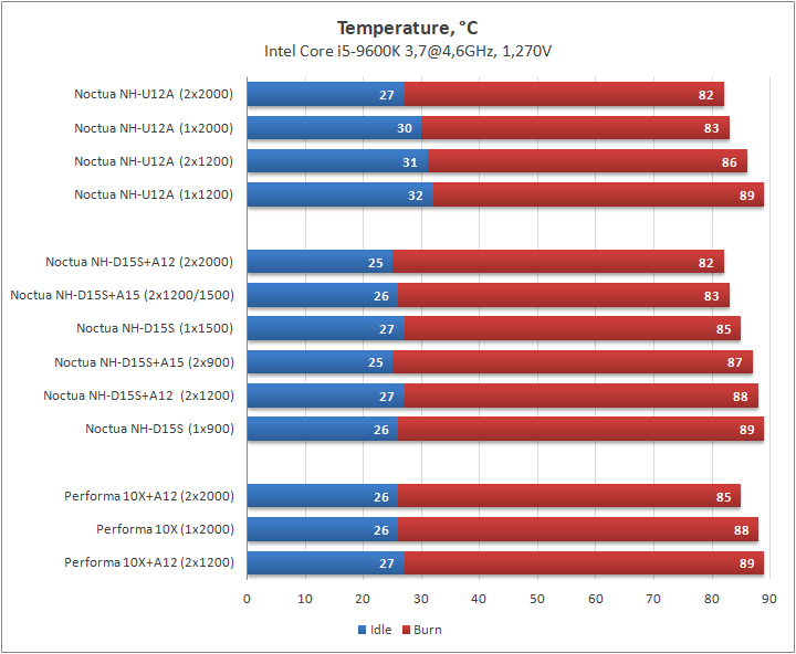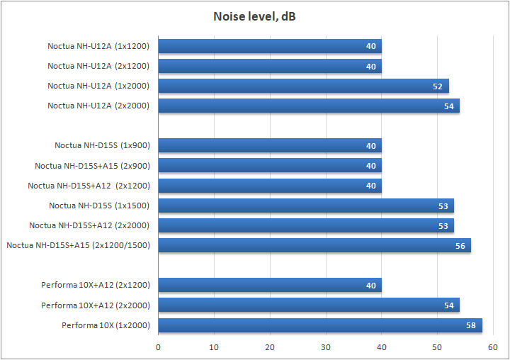 Noctua NH-U12A был испытан с одним и с двумя стоковыми вентиляторам, в бесшумном режиме и на полном ходу. Noctua NH-D15S был опробован в обеих режимах с одним стоковым вентилятором, затем с дополнительным пропеллером NF-A15 PWM, а в финале — с двумя 120-мм NF-A12x25 PWM. Performa 10X смогла пройти тепловой тест лишь на максимальной скорости своего стокового вентилятора, после чего она была опробована в тихом и скоростном режиме с двумя вентиляторами NF-A12x25 PWM. Получившиеся результаты по шуму можно увидеть на графике ниже. Их нужно учитывать, когда мы будем сравнивать между собой результаты по температуре.