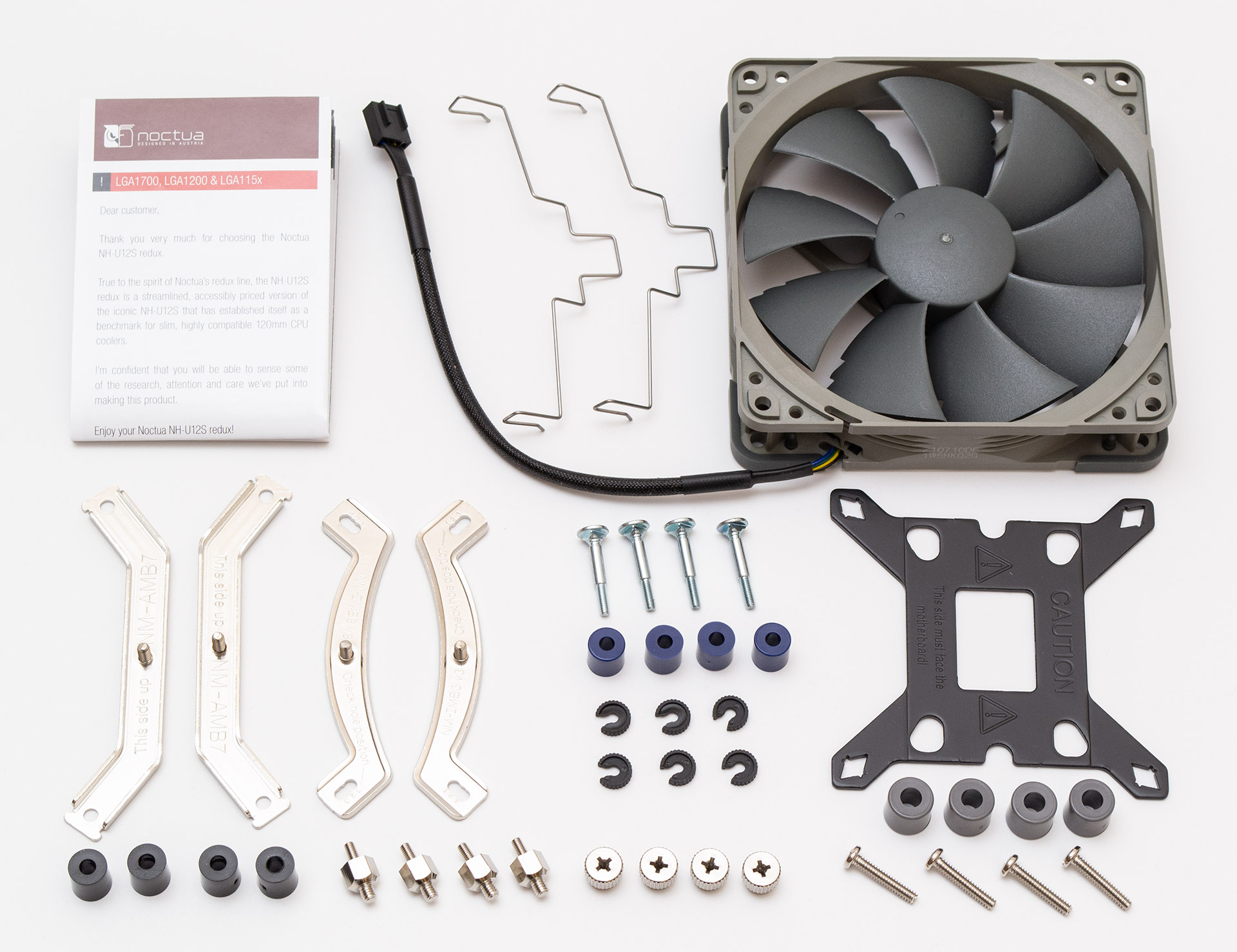 За счет чего произошло сокращение стоимости Noctua NH-U12S redux? По сравнению с оригинальной моделью стало на одну тепловую трубку меньше. Вентилятор использует дизайн и подшипник SSO еще первых поколений продукции компании. Зато он окрашен в нейтральный серый цвет, который понравится «нефанатам» бренда. В комплекте присутствует только минимально необходимый набор креплений для всех актуальных процессорных разъемов. Но нет второго комплекта скоб для вентилятора, отвертки, тюбика с термопастой, переходников и фирменного металлического логотипа. Итак, давайте подробно осмотрим конструкцию этой системы охлаждения и испытаем ее эффективность на практике.