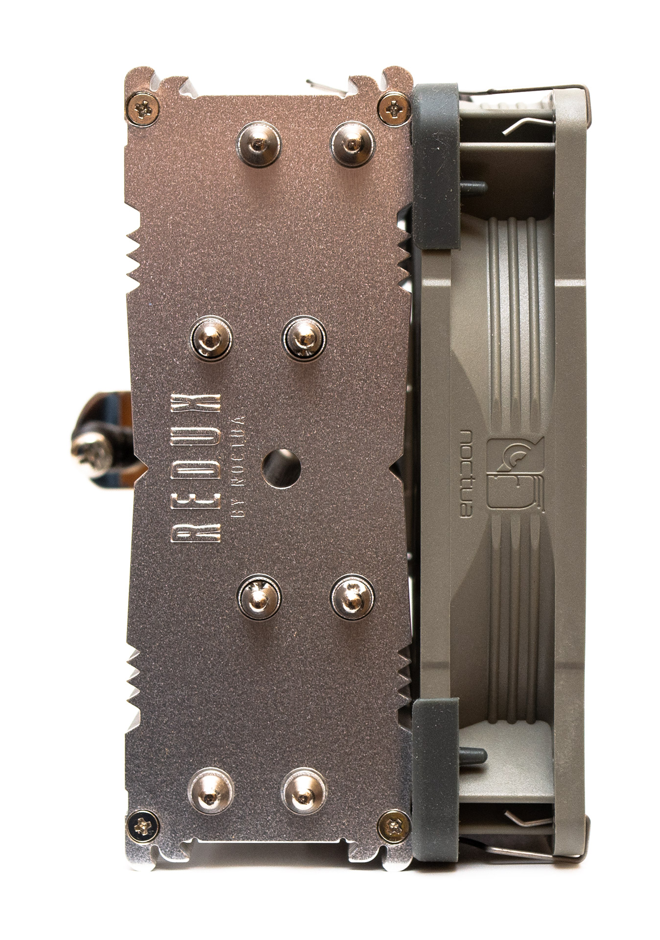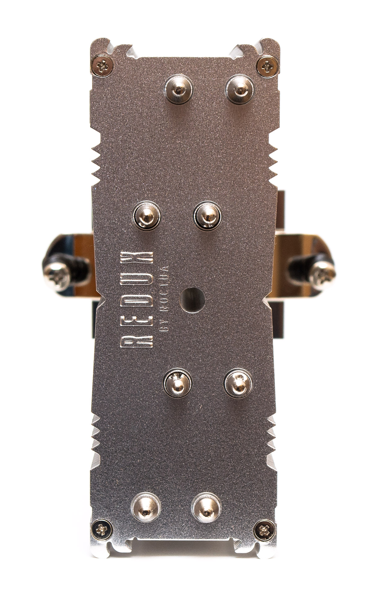 Концы тепловых трубок ничем не закрыты, но смотрятся вполне прилично. Сами трубки расположены в поперечной проекции очень правильно. Надписью REDUX обозначена тыльная сторона радиатора.
