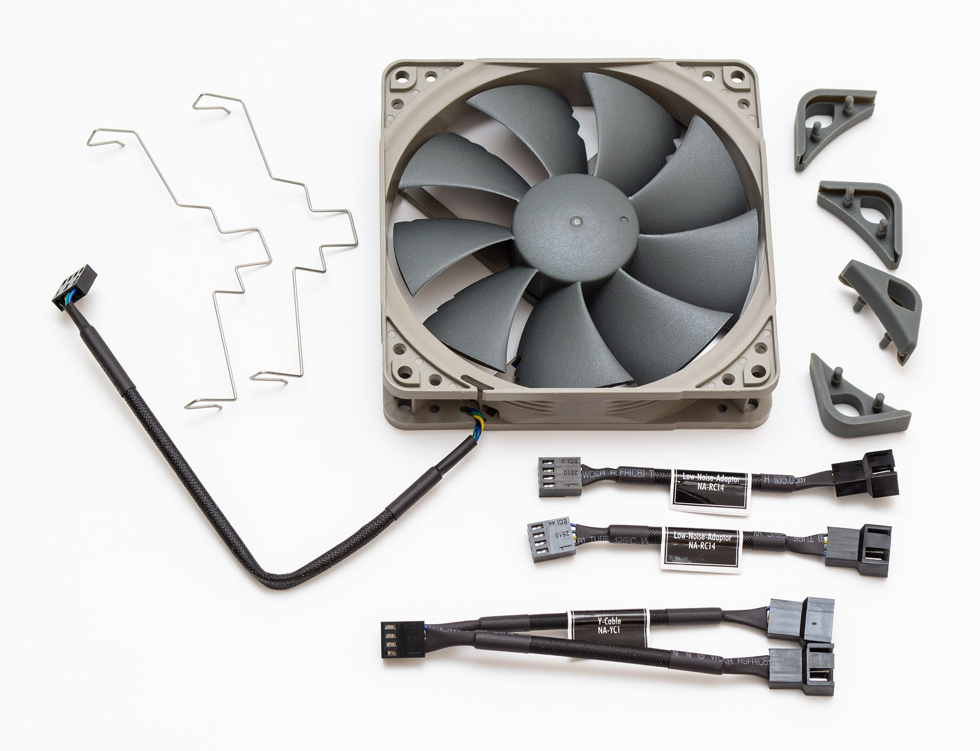 Внутри можно найти второй пропеллер Noctua NF-P12 redux-1700 PWM, две скобы к нему, набор из четырех резиновых демпферов, Y-образный разветвитель питания и два понижающих скорость переходника NA-RC14 LNA. Именно наличие этих элементов вызывает удивление, ведь что мешает отрегулировать скорость с помощью ШИМ?