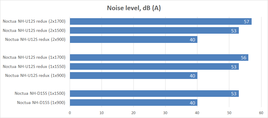 Однако установка второго вентилятора кардинально изменяет ситуацию. С ним Noctua NH-U12S redux демонстрирует одинаковые результаты по эффективности охлаждения относительно Noctua NH-D15S при тех же уровнях шума. И даже способна отыграть один градус, если разогнать вентиляторы до наибольших 1700 об/мин.