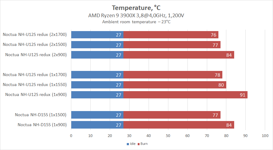 Эффективность системы охлаждения Noctua NH-U12S redux сравнивалась с двухсекционным воздушным охладителем Noctua NH-D15S с одним стоковым вентилятором. Noctua NH-U12S redux испытывалась как с одним стоковым вентилятором, так и со вторым дополнительным пропеллером из комплекта Noctua NA-FK1 redux, установленным сзади радиатора в направлении на выдув из него.