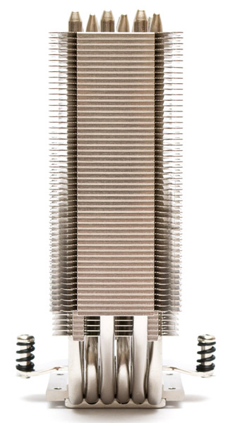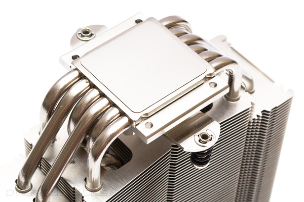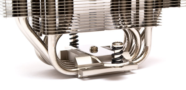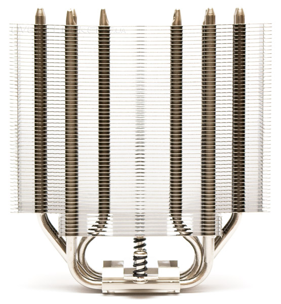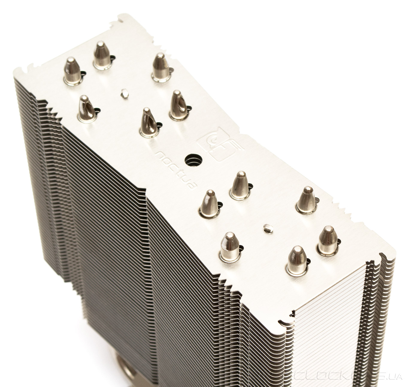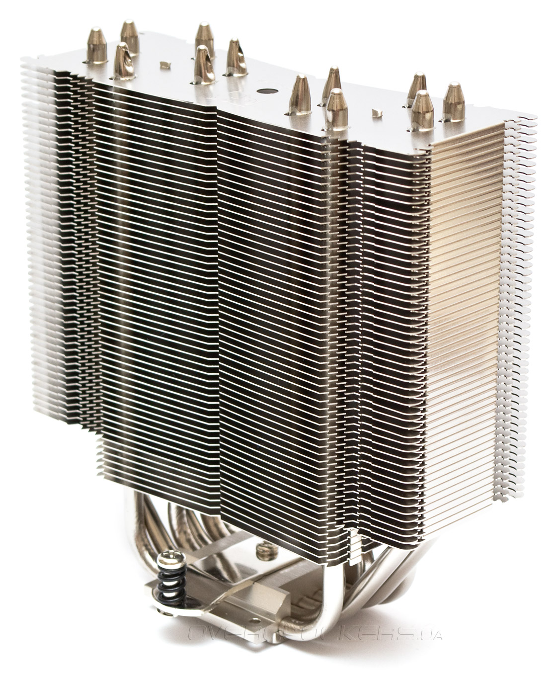 Основной массив радиатора состоит из 51 ребра и имеет зазор 1,7 мм между пластинами. Снизу к нему примыкает еще шесть ребер меньшего размера, с которыми контактирует только две тепловые трубки. Распределение трубок можно считать очень удачным. Крайние в подошве, и соответственно — наиболее холодные, занимают вторую и пятую позицию. Четыре центральных горячих тепловых трубки разведены по краям, максимально далеко друг от друга, туда, где воздушный поток наиболее сильный. Благодаря этому достигается лучшая возможная скорость отвода тепла для данного типа кулера.
