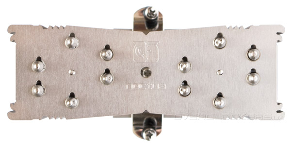 Можно утверждать, что основание Noctua NH-U14S идентично таковому у прошлых моделей. В качестве рудимента остались четыре отверстия по углам, к которым раньше привинчивались крепежные лапы. Подошва по-прежнему не зеркальная, на ней отчетливо видны радиальные следы от фрезы.