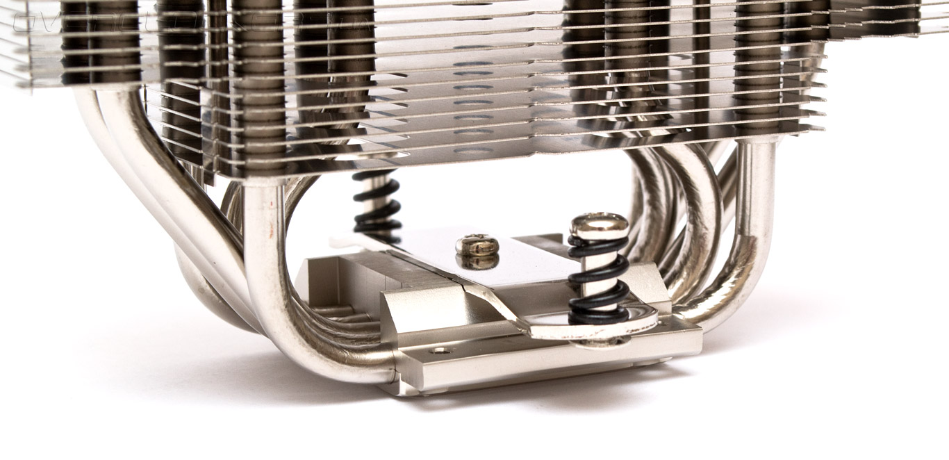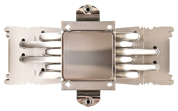 Вид снизу позволяет лучше рассмотреть расположение тепловых трубок в подошве, но не раскрывает решительно ничего нового о конструкции радиатора. Никелированные тепловые трубки пропаяны в местах соединения с ребрами и основанием.
