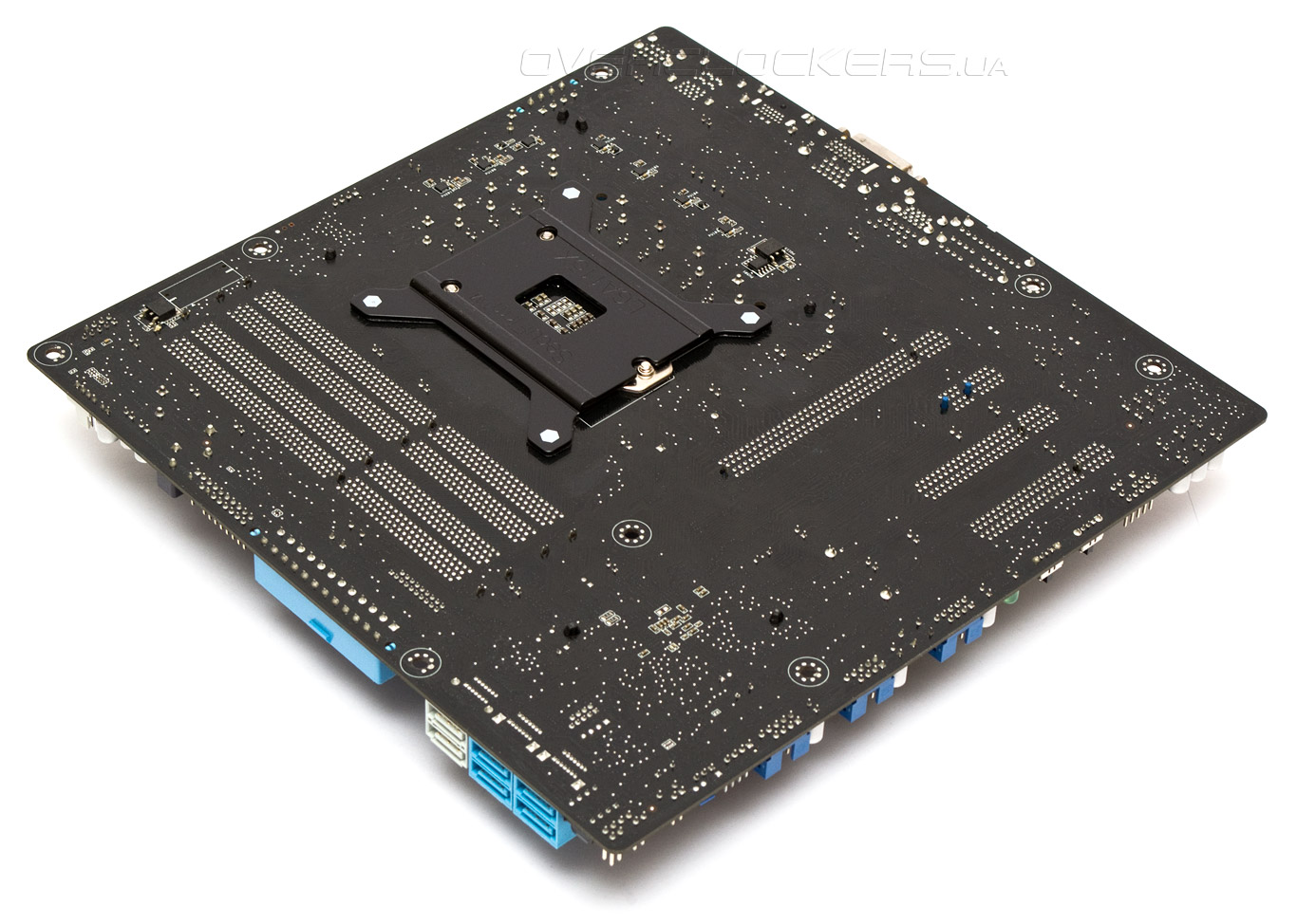 Для начала продеваем усилительную пластину через отверстия материнской платы. Допускается только один вариант ориентации.