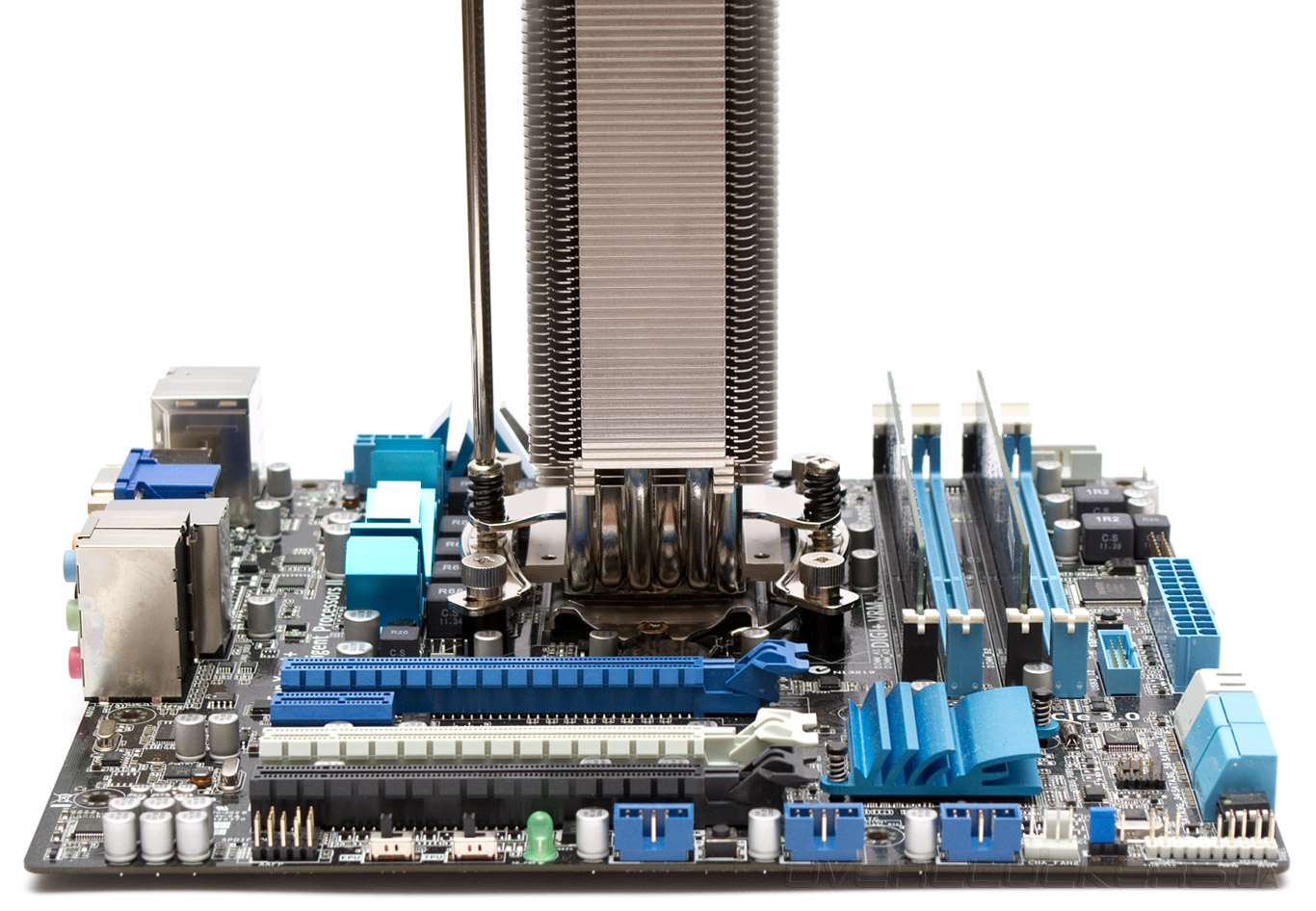 На платформе Intel LGA1155 вентилятор не касается даже первого слота оперативной памяти. Но на платформах AMD установка памяти с высокими радиаторами в первый слот будет невозможна.