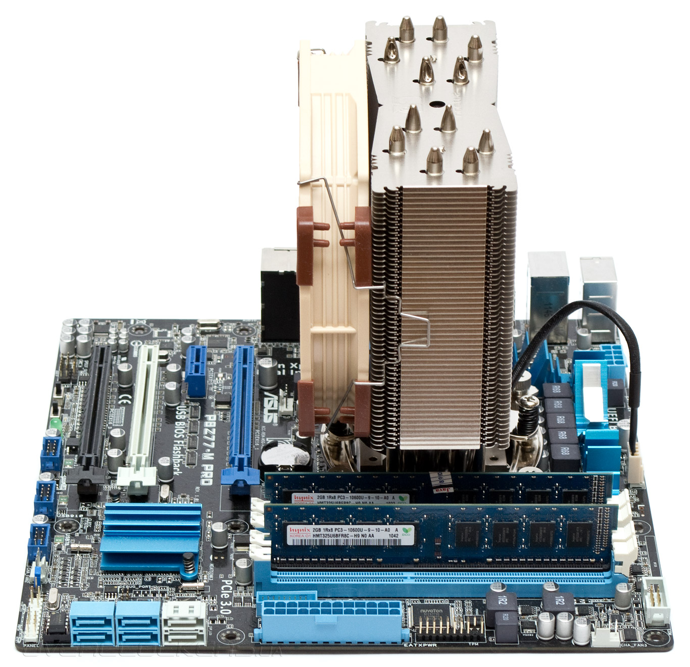 Зато до первого слота PCI-E остается несколько сантиметров. Как видно, из-за своих габаритов Noctua NH-U14S совместим далеко не со всеми платами. Поэтому, перед приобретением внимательно ознакомьтесь со списком совместимых «материнок» на официальном сайте.