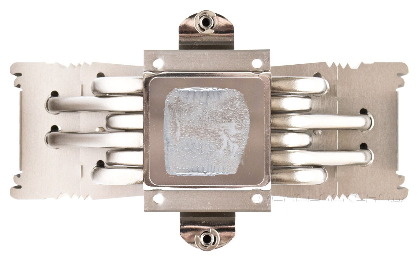 Вид снизу позволяет лучше рассмотреть расположение тепловых трубок в подошве, но не раскрывает решительно ничего нового о конструкции радиатора. Никелированные тепловые трубки пропаяны в местах соединения с ребрами и основанием.