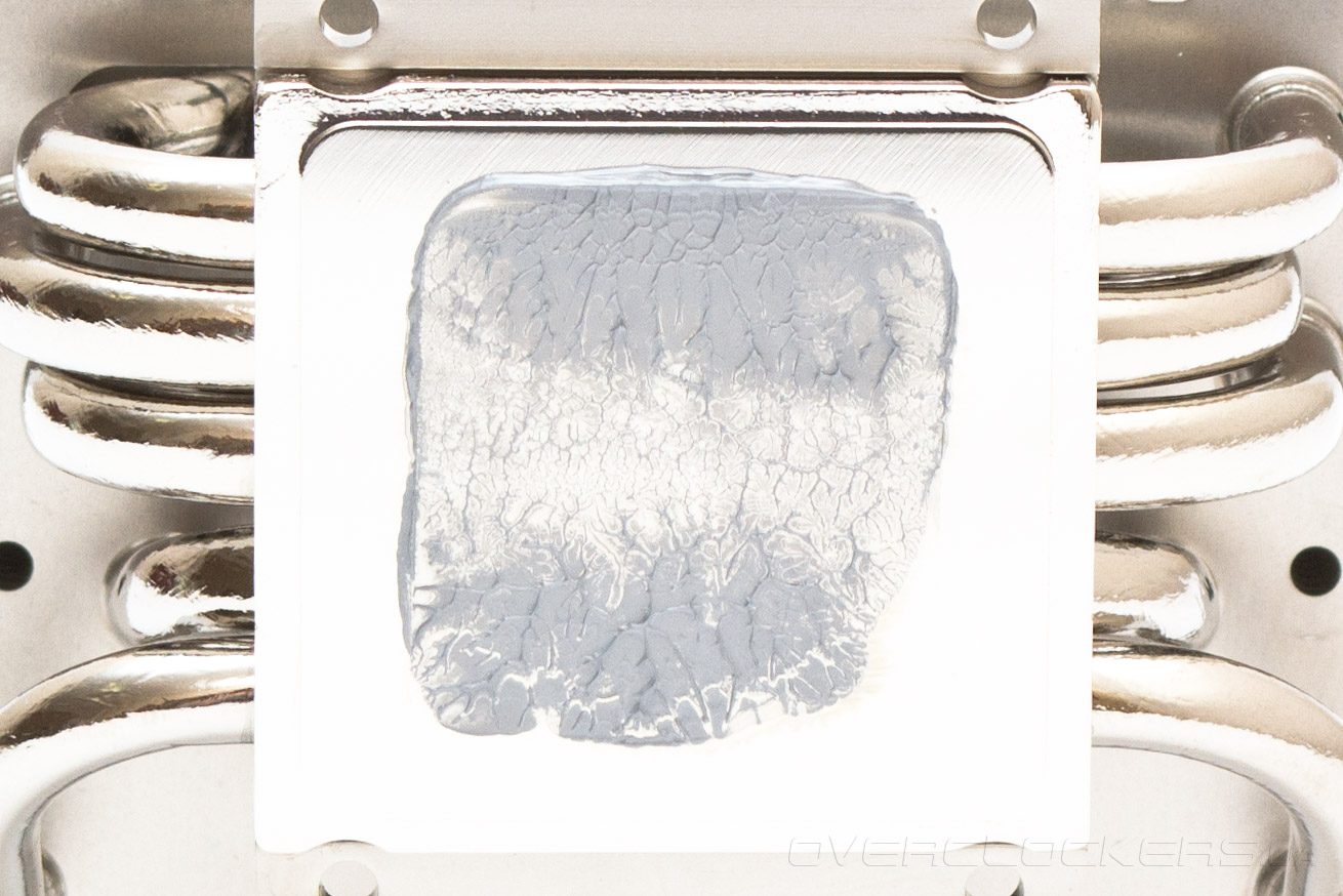 Отпечаток термоинтерфейса на подошве кулера подтвердил предварительные выводы касательно ее кривизны. По центру отчетливо виден бугор, а правый нижний край приподнят. Это вряд ли отразится на качестве охлаждения процессоров Intel, но может привести к снижению эффективности при использовании данного кулера на решениях AMD, учитывая особенности их конструкции.