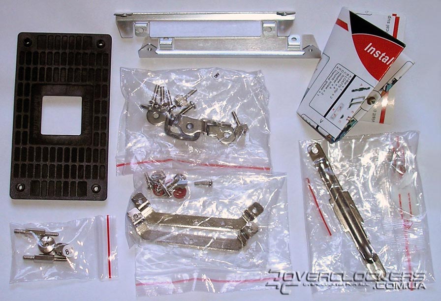 Комплект крепежей также отличался – кроме платформ Intel (Socket 775/478) и AMD64, поддерживался Socket A, при условии наличия монтажных отверстий вокруг процессорного разъема. Само же крепление было поистине уникальным. Так, на обратную сторону платы устанавливалась backplate, через которую продевались длинные болты. Далее ставился кулер, и сверху основание прижималось пластиной, и после этого, 813-граммовую "махину" необходимо было фиксировать четырьмя гайками М3, причем, руками. Ключа, естественно, в комплекте не было.