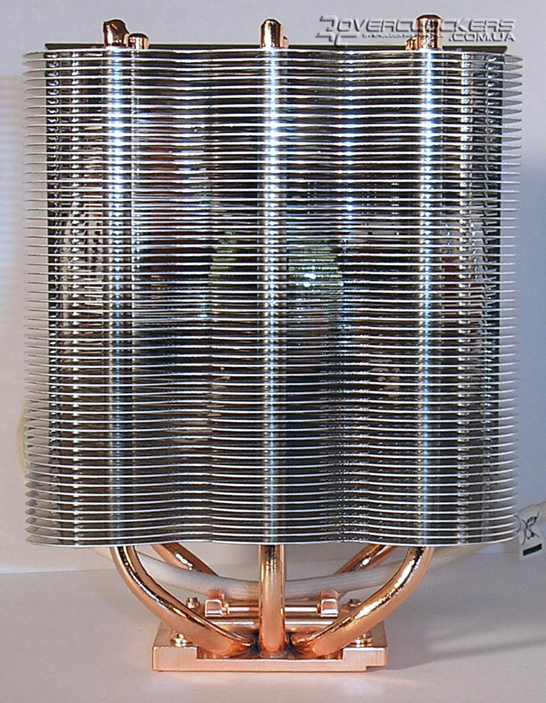По конструкции кулер Sonic Tower хоть и относится к башенному типу, но все же имеет некоторые отличия. Так, на три U-образные тепловые трубки, припаянные к достаточно широкому медному основанию, с противоположных концов надето по 55 алюминиевых пластин.