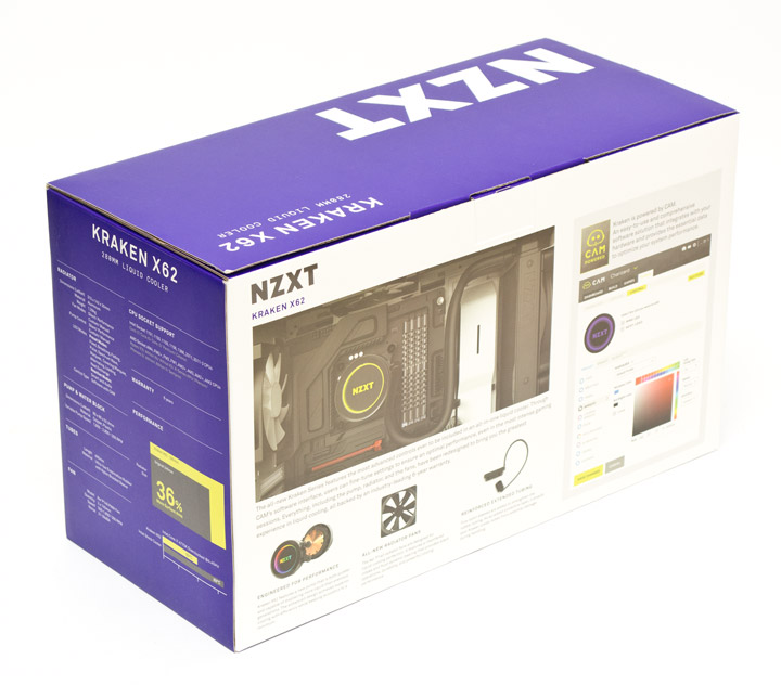 Упаковка Kraken X62 выглядит сдержанно, но вполне презентабельно. На ее фронтальной части есть изображение продукта, сбоку изложены сухие технические характеристики, а с обратной стороны коротко описаны все основные достоинства данной системы жидкостного охлаждения.
