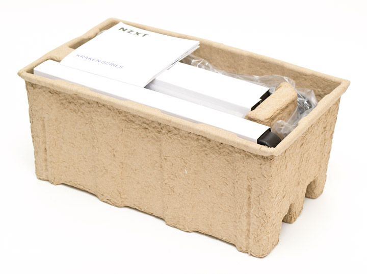Как и подавляющее большинство аналогичных систем, Kraken X62 внутри коробки упакован в лоток из прессованного картона. Радиатор и вентиляторы дополнительно обернуты листами из белого картона, все остальные детали расфасованы по полиэтиленовым пакетикам. Демпферов, как таковых, нет. Складывается впечатление, что это изделие хотели не столько защитить от механических повреждений, сколько от протекания хладагента на другие продукты, лежащие рядом на полке или на складе.