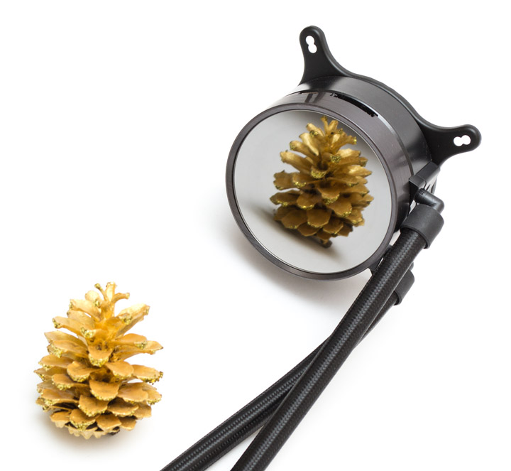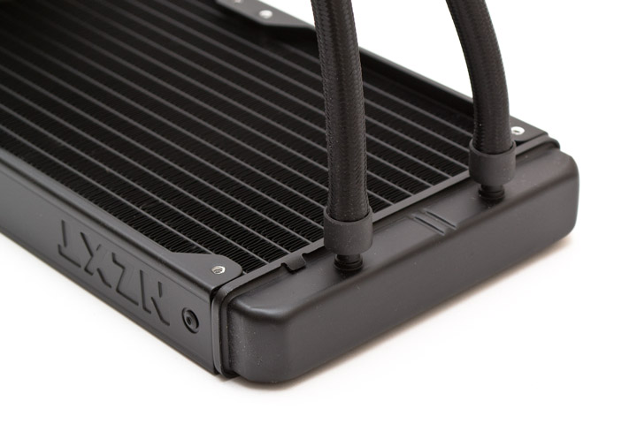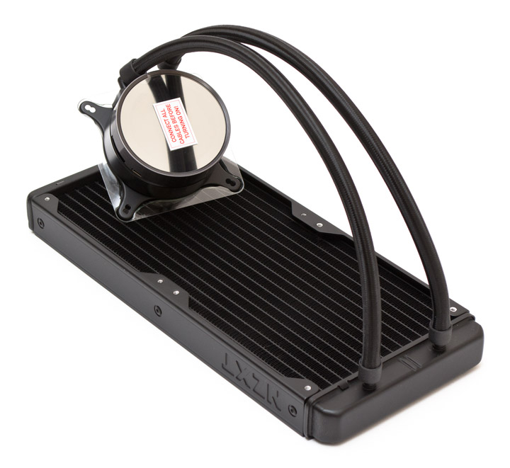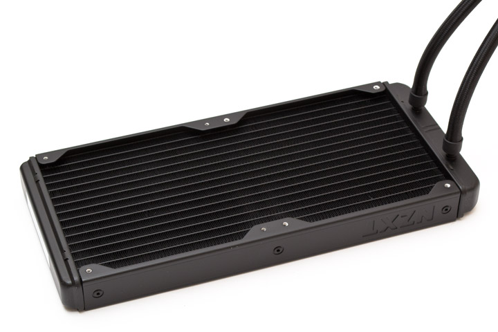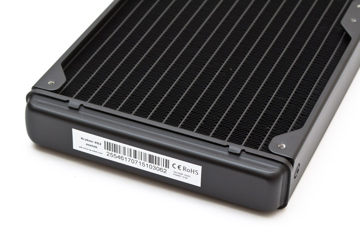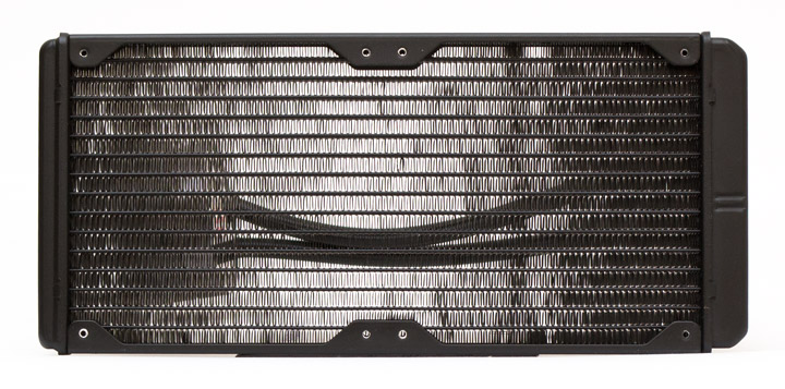 Ребра радиатора ленточного типа, с довольно высокой плотностью расположения в 20 FPI (пластин на дюйм). Между ребрами, вдоль, протянулись 17 каналов, через которые, собственно, и прокачивается хладагент. Суммарная площадь рассеивания тепла приблизительно составляет рекордные для данного класса СВО 9200 см2. Вес всей системы без учета вентиляторов — 890 грамм. С двумя установленными вертушками и креплениями он увеличивается до заявленных производителем 1,29 кг.