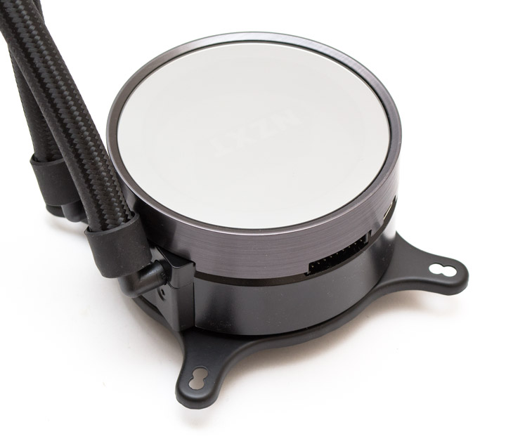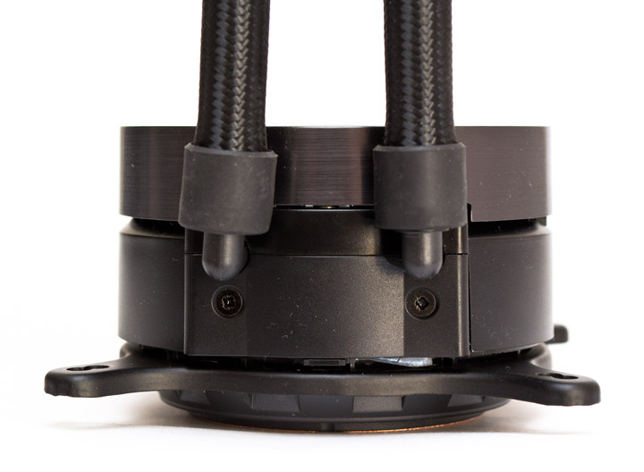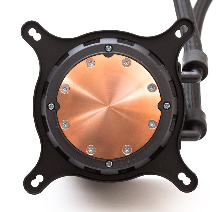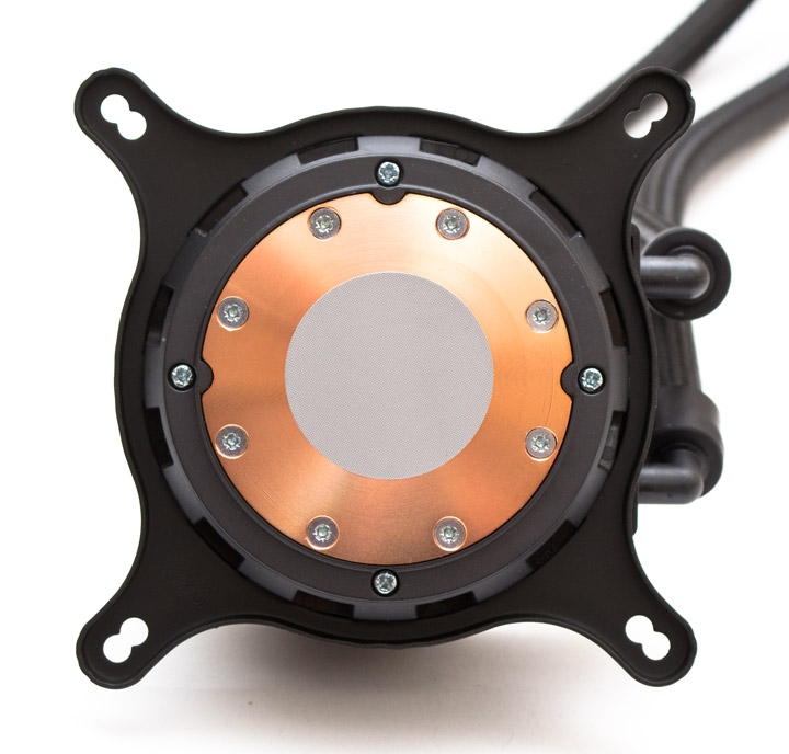 Основание круглое и медное, диаметром в 54 мм. Традиционно для продуктов, основанных на патентованных технологиях Asetek, подошва кулера крепится к помпе при помощи восьми винтов, вкрученных по периметру. Само основание имеет «коническую» форму, что заметно даже визуально по характерному выступу в центре, и по расходящимся от него концентрическим кругам шлифовки. Проверка при помощи металлической линейки лишь подтвердила эту гипотезу. Рамка с лапами крепления подпружинена, легко снимается путем надавливания и поворота против часовой стрелки. Монтаж происходит в обратном порядке. По умолчанию тут одета рамка, подходящая для установки кулера на сокеты Intel LGA.