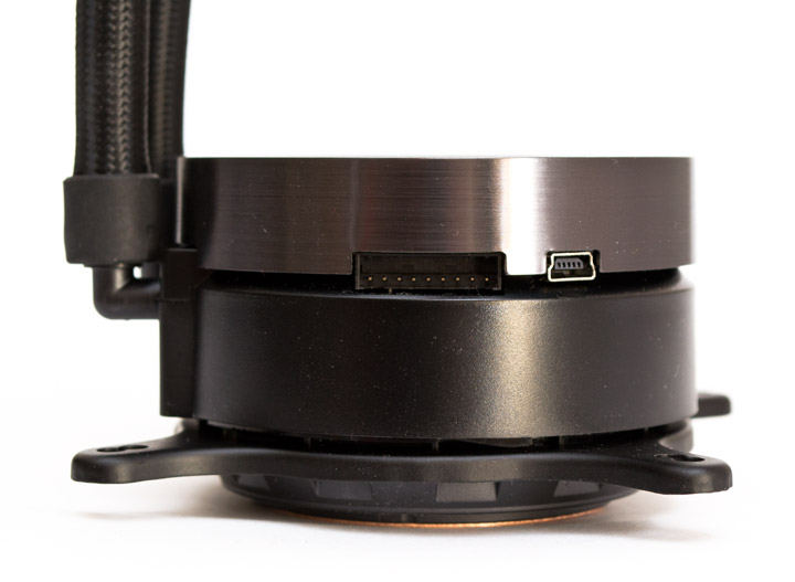 Справа от шлангов находится один специальный разъем на девять контактов, куда общим коннектором включается питание, кабеля для вентиляторов и колодка для мониторинга скорости помпы. За ним есть еще один разъем для подключения кабеля Mini-USB, через который осуществляется программное управление устройством — скоростью вентиляторов, помпы и настройками подсветки.