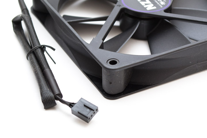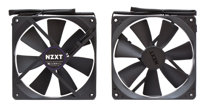 В качестве стоковых вентиляторов в системе Kraken X62 использованы два фирменных пропеллера NZXT Aer P140 (RF-AP140-FP) формата 140х140х26 мм. Они обладают гидродинамическим подшипником и семью неширокими прямыми лопастями. Из аэродинамических оптимизаций в них можно отметить специальную покатую рамку, увеличивающую поток воздуха, и законцовки на крыльчатке, снижающие уровень турбулентного шума. Скорость вентилятора регулируется при помощи ШИМ и может составлять от 500 до 1800 об/мин при уровнях шума от 36 до 64 дБ (А). Паразитных призвуков в двигателе нет, пропеллеры могут сохранять бесшумность вплоть до 650 об/мин и 40 дБ (А). На максимальной скорости уровень шума получается очень высоким. Производитель обещает для этих моделей срок наработки на отказ в 60 тысяч часов эксплуатации.
