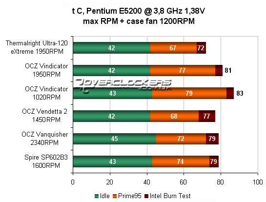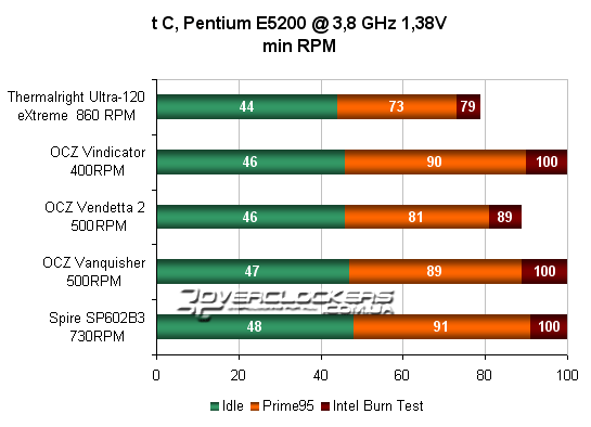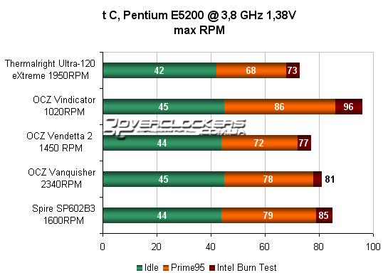Тестирование кулеров производилось исключительно в закрытом корпусе, так как именно в таком положении они и будут использоваться 90% пользователей. Для тестирования использовался процессор Pentium E5200 на ядре Wolfdale 2M, который был разогнан до 3,8 ГГц. Это не максимальный разгон данного экземпляра, но такая частота была установлена для того, чтобы процессор не включал троттлинг, когда с задачей не смогут справиться более слабые кулера. Тестирование проводилось при отключении корпусного вентилятора на минимальных и максимальных оборотах вентилятора каждого кулера. Обороты отслеживалась по показаниям датчика материнской платы, а минимальные обороты вентиляторы устанавливались через регулятор Zalman Fan mate. Вентилятор в Vendetta 2 стартовал лишь с отметки 8,2 В на частоте оборотов 500 RPM (что даже ниже заявленного минимального порога), остальные без проблем стартовали на 5 В. Поскольку на самом массивном Vindicator установлен тихоходный вентилятор, то для проверки его потенциала дополнительно проводился тест этого кулера с вентилятором 120 mm Titan TFD-12025L12B на 1950 RPM. Для всех кулеров проведено дополнительное тестирование при включении заднего корпусного вентилятора 1200 RPM. Рассматриваемые кулера мы дополнительно сравним с одним из лучших современных воздушных кулеров - Thermalright Ultra-120 eXtreme с вентилятором Titan TFD-12025L12B.
