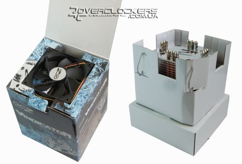 Внутри коробки в пенополиуретановом кожухе расположен кулер, вентилятор и набор аксессуаров. Комплектация следующая: