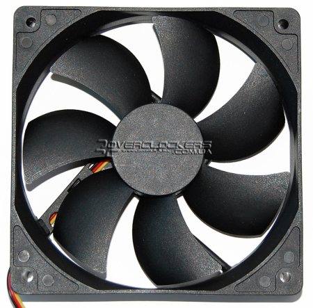 Вентилятор диаметра 120 мм, который идет в комплекте, рассчитан на 1000 RPM, создавая при этом воздушный поток 40 CFM при очень низком уровне шума 18,5 дБ. Подключается к 3-pin разъему. Никаких опознавательных знаков и наклеек с техническими характеристиками на нем нет.