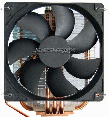 Вентилятор диаметром 120 мм крепится на специальную рамку, которая прикручивается к основанию кулера. Без рамки конструкция выглядит следующим образом: