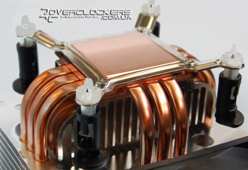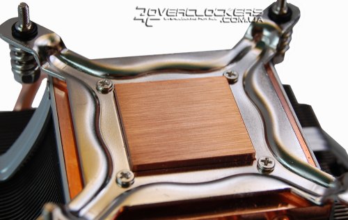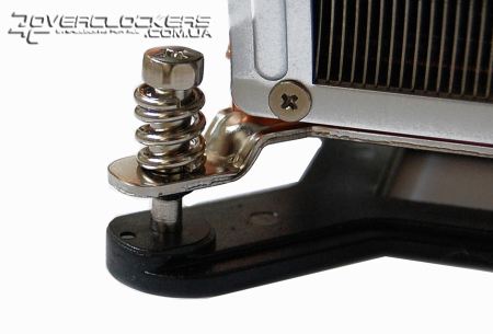 Крепление этого массивного кулера на LGA 775 осуществляется с помощью стандартных защелок, рамка с которыми прикручивается к основанию.