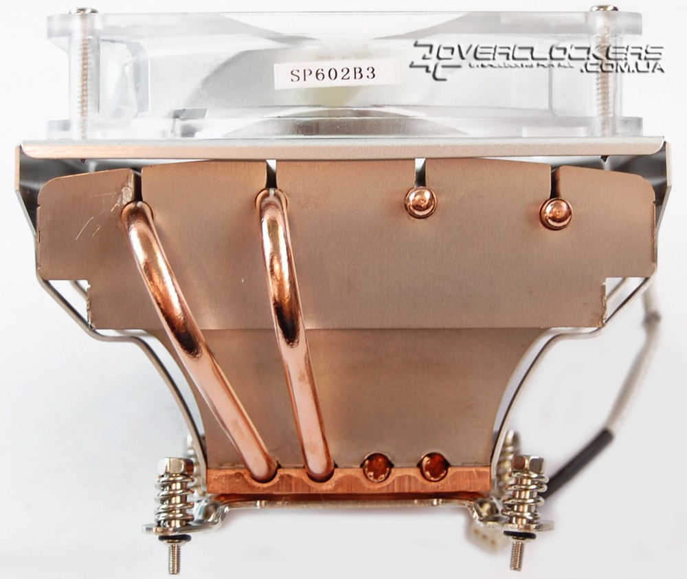 Изначально к основанию прикручены две пластины с защелками для крепления под Socket LGA 775. На медное основание уже нанесена белая термопаста.