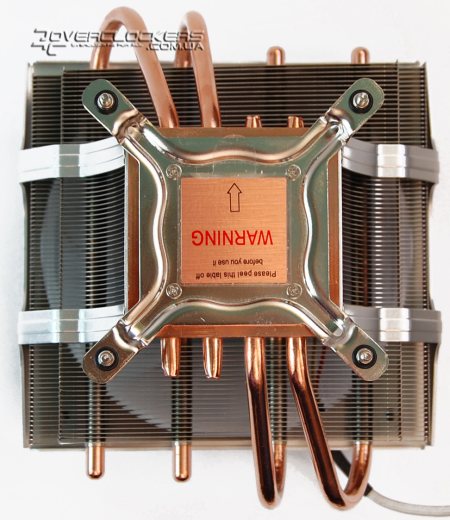 К нижней части кулера уже прикручена рамка с креплением под Sockets 775. Основание, контактирующее с крышкой процессора, защищено на время транспортировки наклейкой.