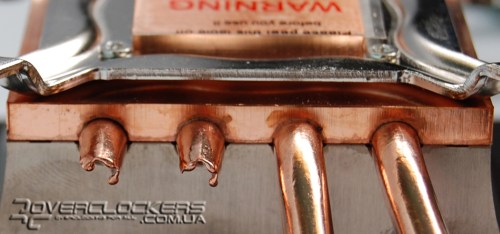 Тепловые трубки расположены в специальных желобках основания. Место контакта тщательно пропаяно, это заметно по остаткам припоя.