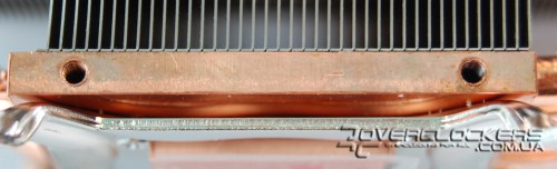 А в чем же причина столь низких результатов? Возможно дело в малой площади контакта тепловых трубок с основанием. Поскольку они находятся в закрытой камере, нам не видно, как осуществляется контакт, возможно для трубок нет желобков и не припаяны они вовсе (просветы заметны). Да и три другие трубки находятся выше и контаткируют не с основанием, а с первыми тремя трубками. Врядли такой перекрестный контакт с небольшой площадью соприкосновения способствует эффективной теплопередаче от подошвы к пластинам радиатора (которых тоже немного).