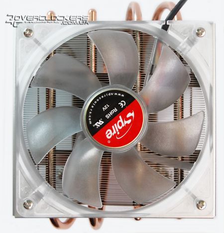 Вентилятор на керамическом подшипнике имеет изменяемую скорость оборотов от 400 до 2400 RPM, создавая поток в 32 CFM, подключается к 3-pin разъему. Судя по данным мониторинга материнской платы, максимальная скорость оборотов вентилятора оказалось чуть ниже заявленных 2400 оборотов в минуту.