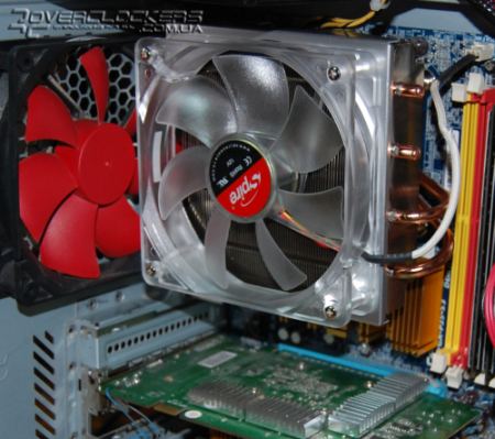 И без того немаленький OCZ Vindicator с вентилятором приобретает еще более громадные размеры. Причем высота то у кулера небольшая, а вот ширина и глубина уже значительные, и вполне возможно, что он упрется в какие-то компоненты с высокими радиаторами на материнской плате.