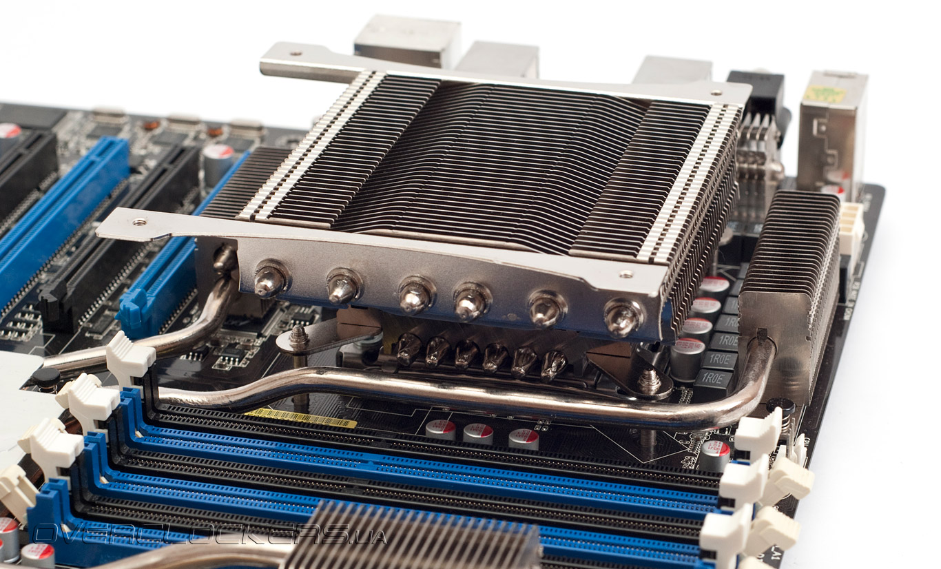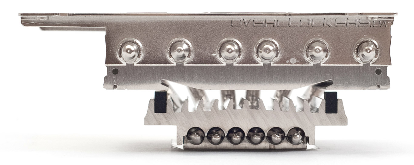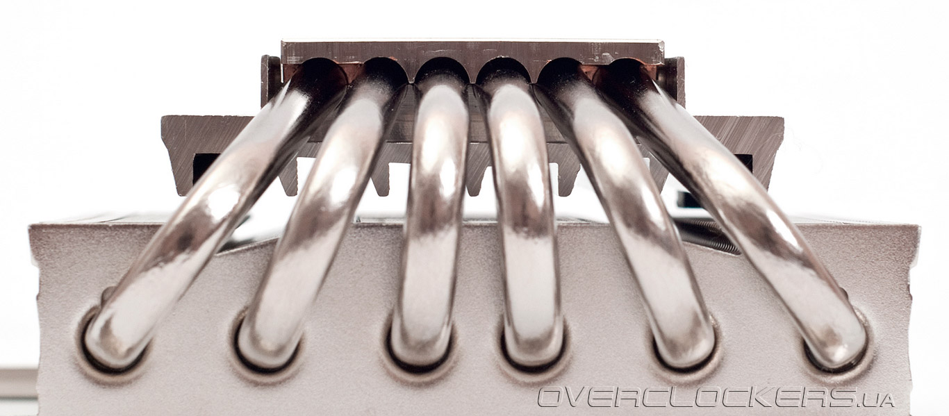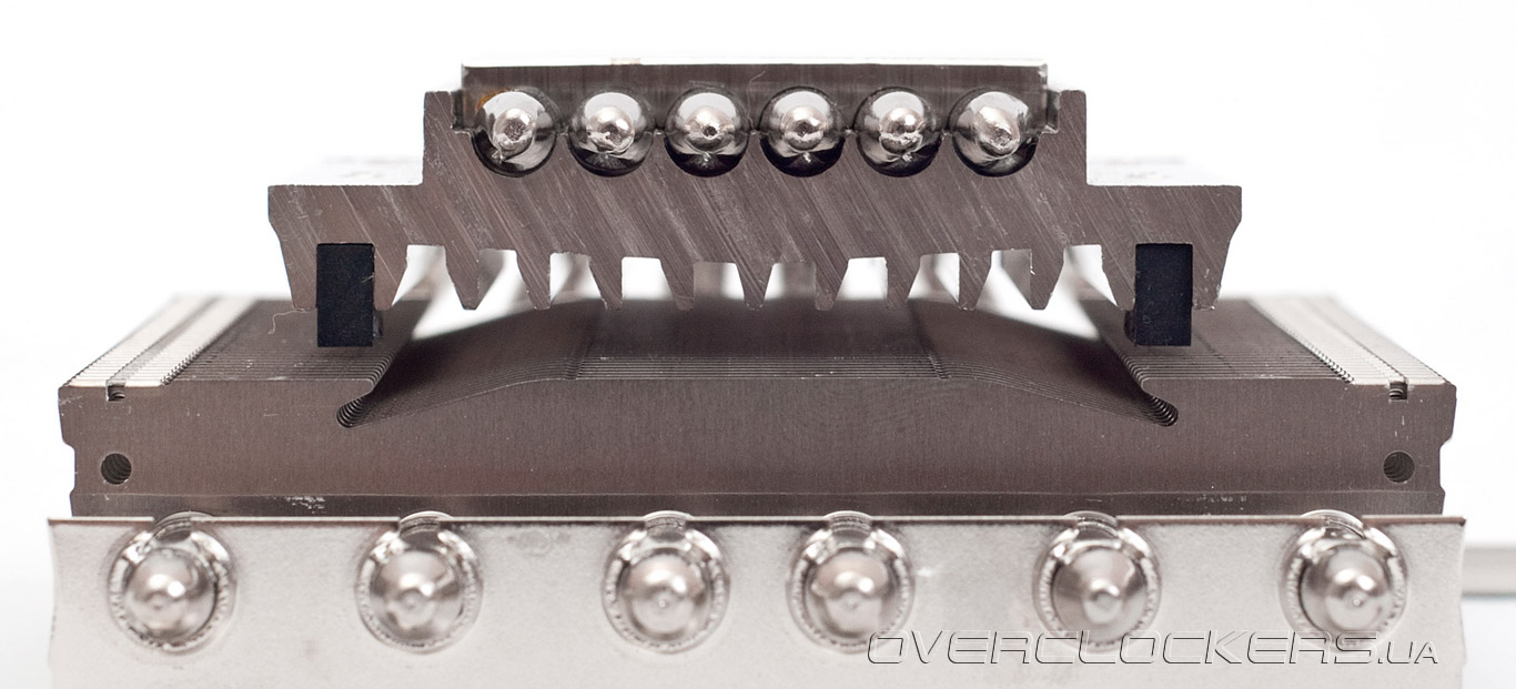 Еще один небольшой радиатор с желобками для лучшего контакта с тепловыми трубками располагается у основания кулера. Специальные уплотнители не позволят радиатору деформироваться даже под тяжестью 120-мм вентилятора.